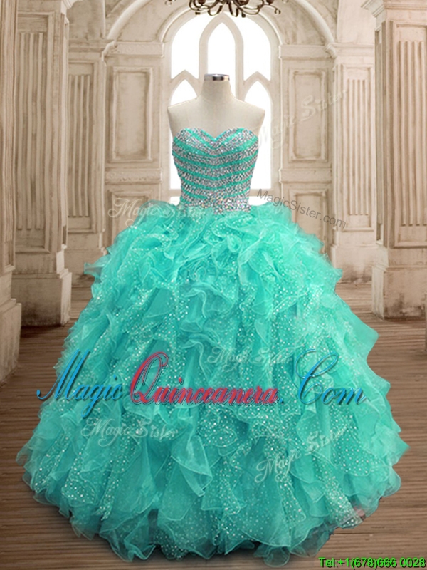 , Gorgeous Beaded and Ruffled Big Puffy Sweet 16 Dress in Turquoise