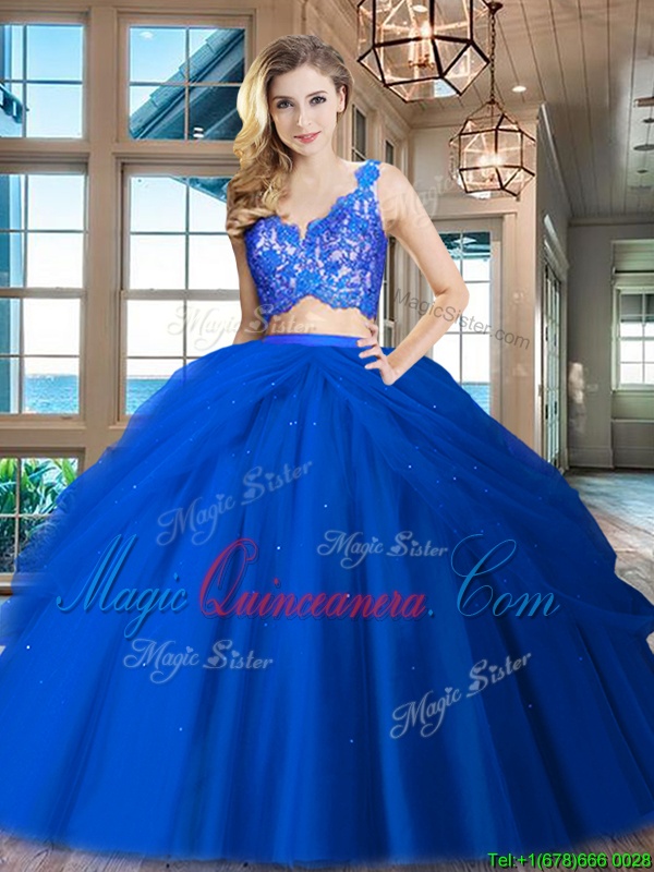 Gorgeous Floor Length Royal Blue 15 Quinceanera Dress Tulle Sleeveless Lace and Ruffled Layers - Magic Quinceanera