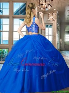 Gorgeous Floor Length Royal Blue 15 Quinceanera Dress Tulle Sleeveless Lace and Ruffled Layers
