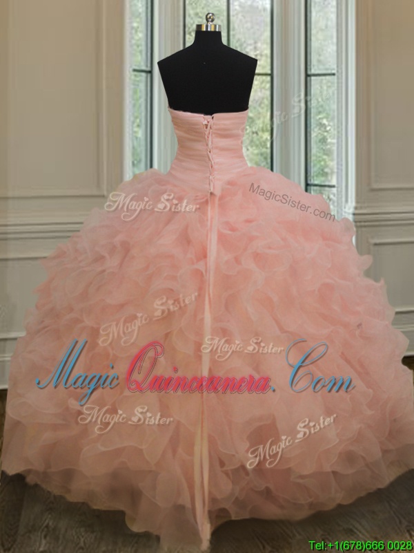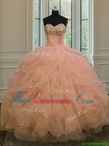 Gorgeous Peach Ball Gowns Beading and Ruffles 15th Birthday Dress Lace Up Organza Sleeveless Floor Length