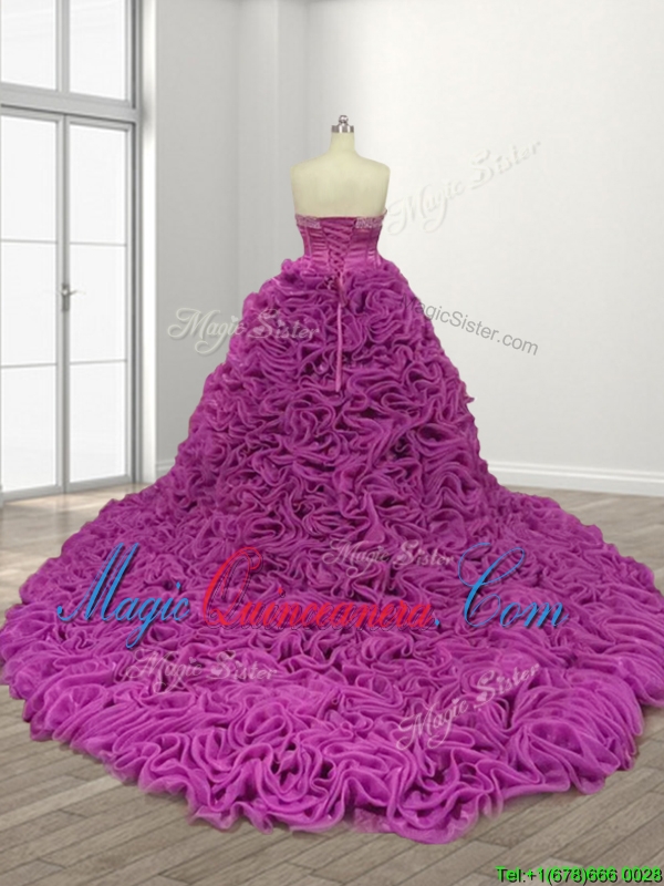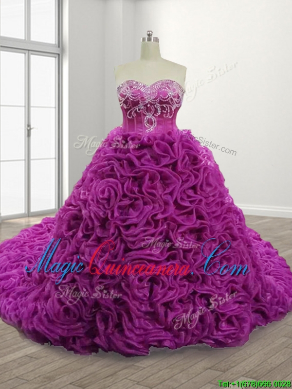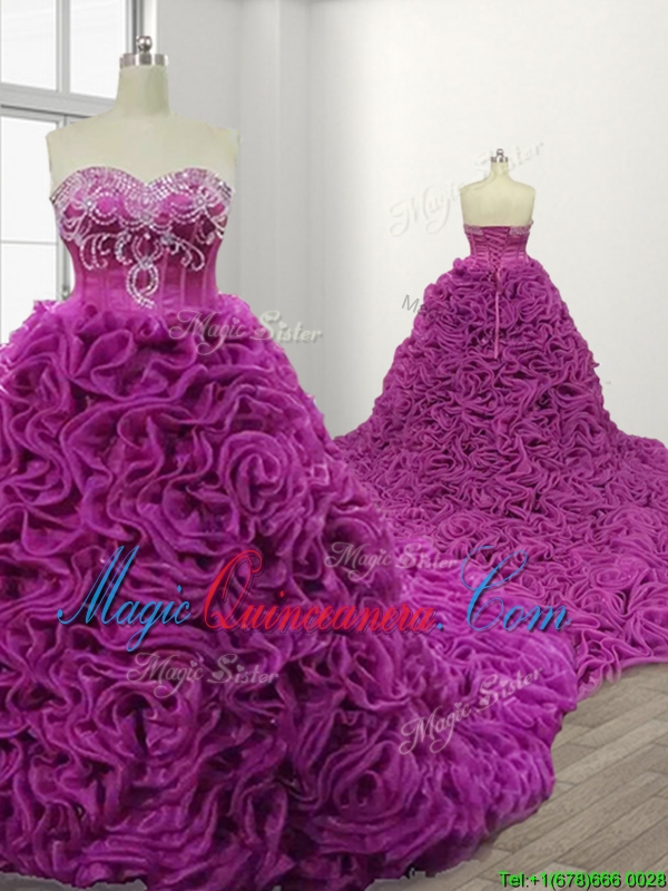 , Gorgeous Rolling Flowers Court Train Quinceanera Gown with Beading