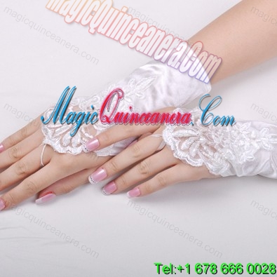, Gorgeous Satin Fingerless Wrist Length Bridal Gloves With Appliques