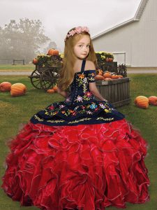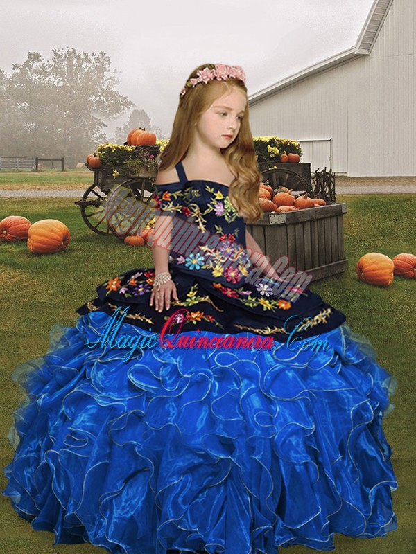Graceful Blue Straps Neckline Embroidery and Ruffles Pageant Dress for Womens Sleeveless Lace Up
