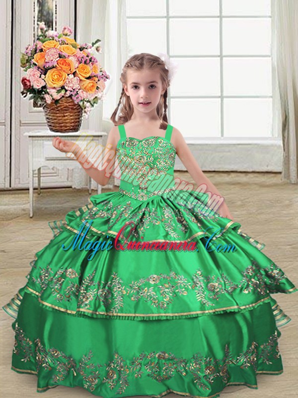 Graceful Green Satin Lace Up Pageant Gowns Sleeveless Floor Length Embroidery and Ruffled Layers