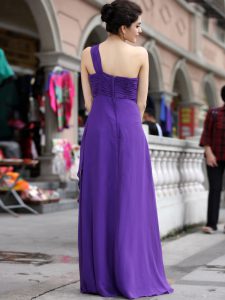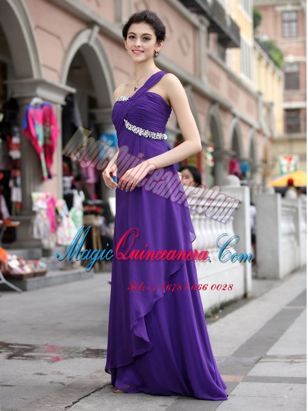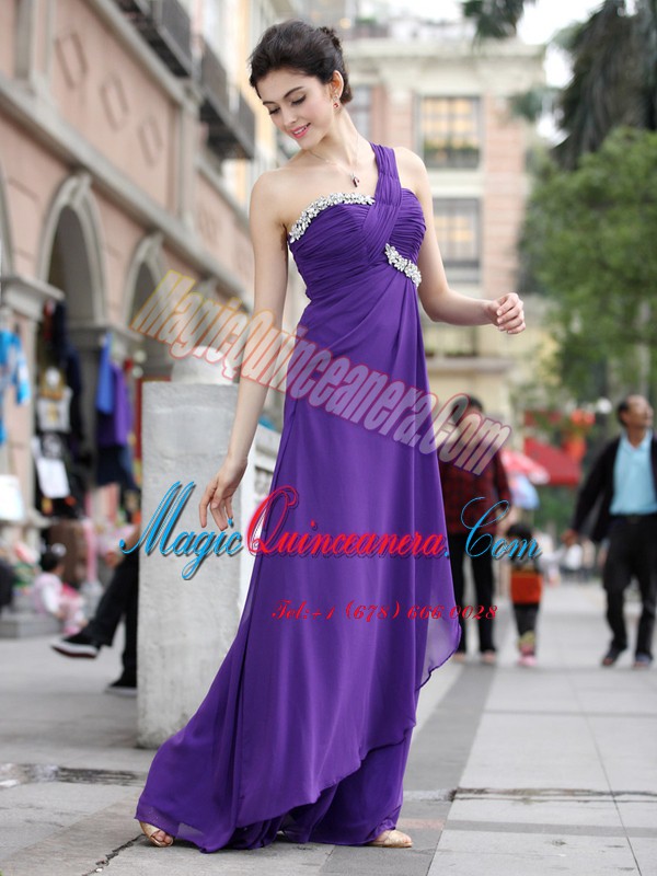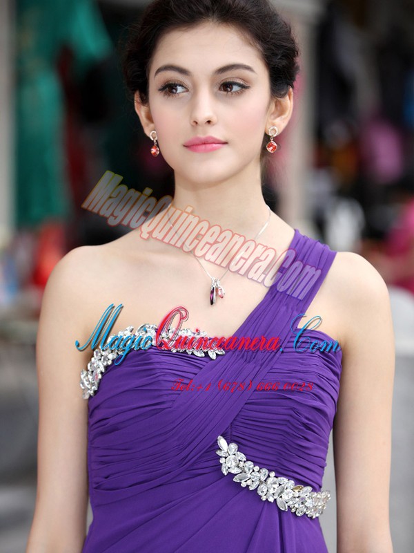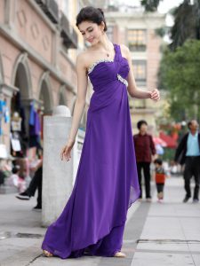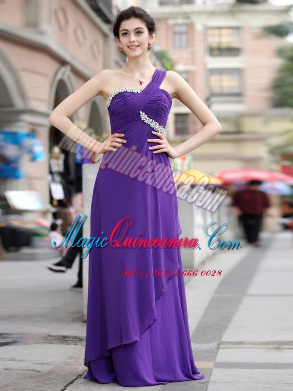 Graceful One Shoulder Purple Sleeveless Floor Length Beading Zipper Dress for Prom