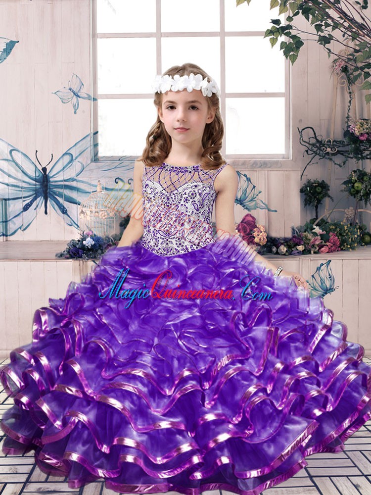 Graceful Organza Scoop Sleeveless Lace Up Beading and Ruffles Little Girl Pageant Gowns in Lavender