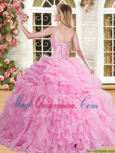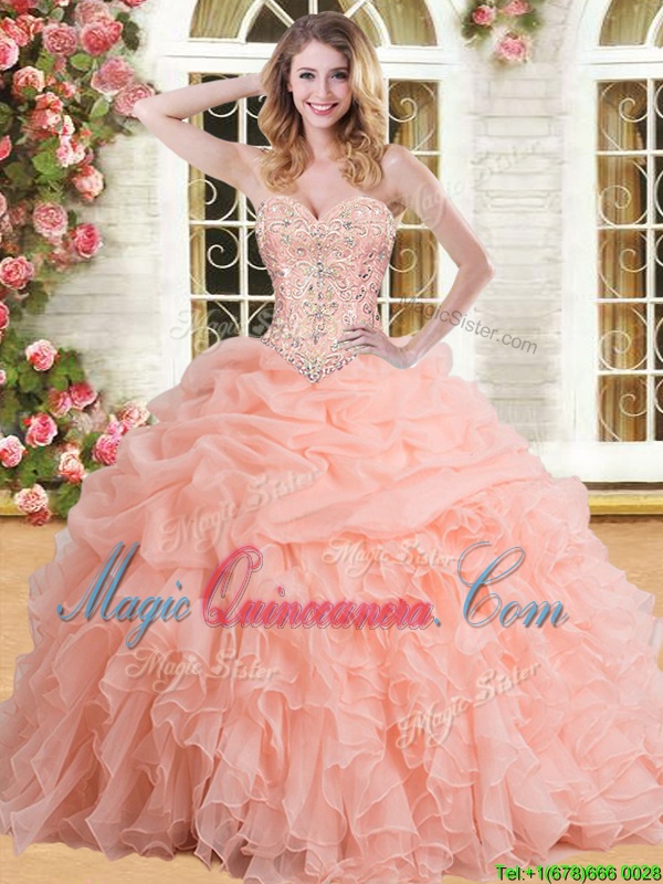 Graceful Peach Sweetheart Neckline Beading and Appliques and Ruffles and Pick Ups 15 Quinceanera Dress Sleeveless Lace Up