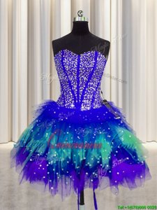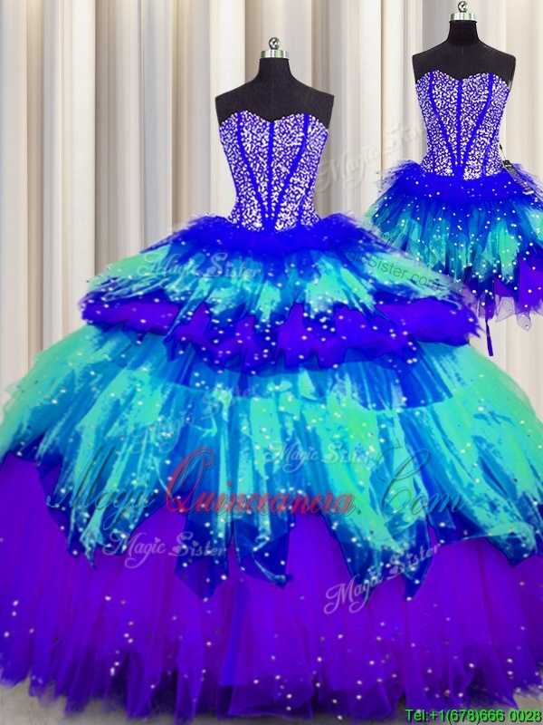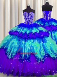 Graceful Three Piece Visible Boning Sleeveless Beading and Ruffles and Ruffled Layers and Sequins Lace Up Ball Gown Prom Dress