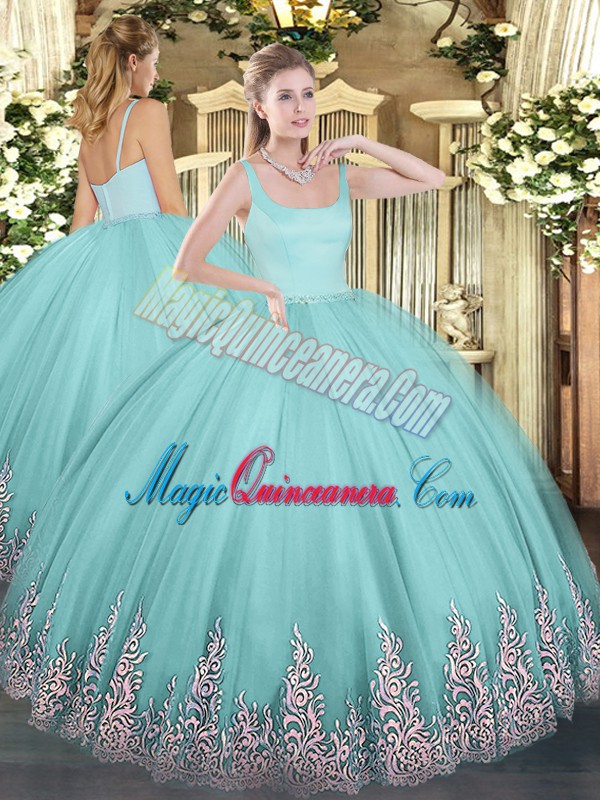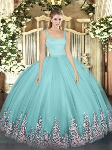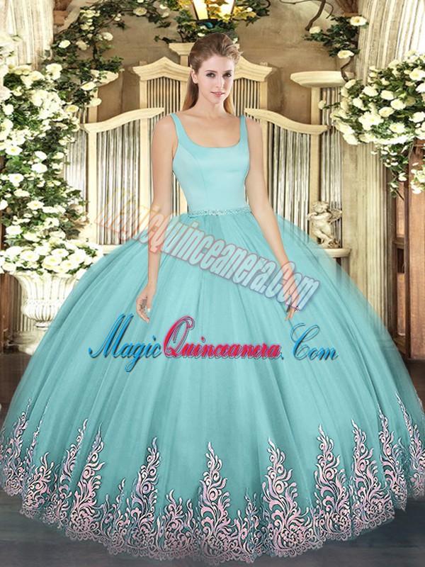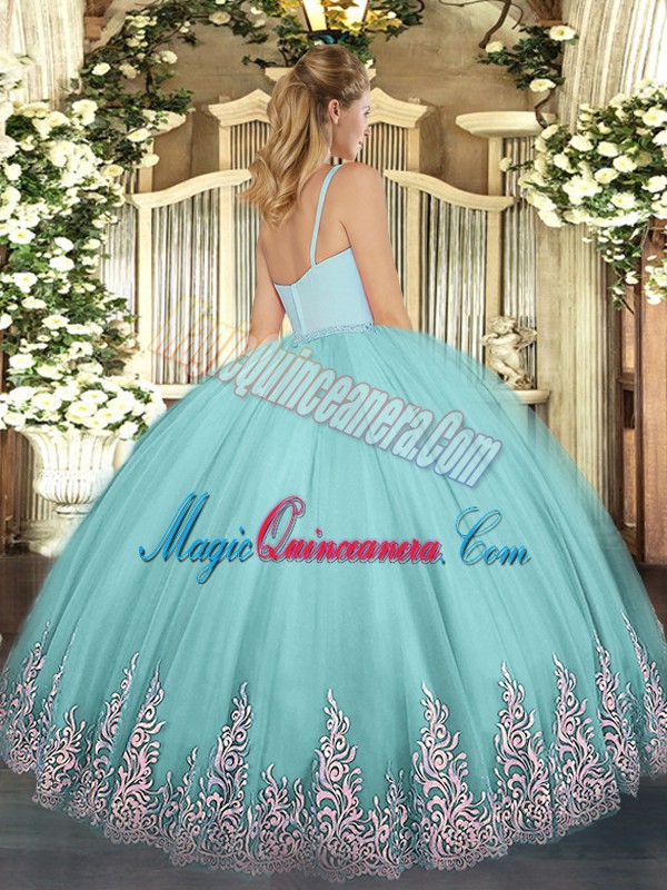 Great Aqua Blue Ball Gowns Appliques Quince Ball Gowns Zipper Tulle Sleeveless Floor Length