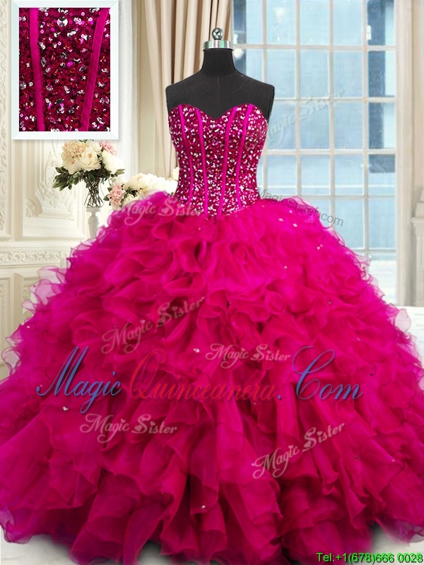 Great Fuchsia Organza Lace Up Quince Ball Gowns Sleeveless Floor Length Beading and Ruffles and Sequins