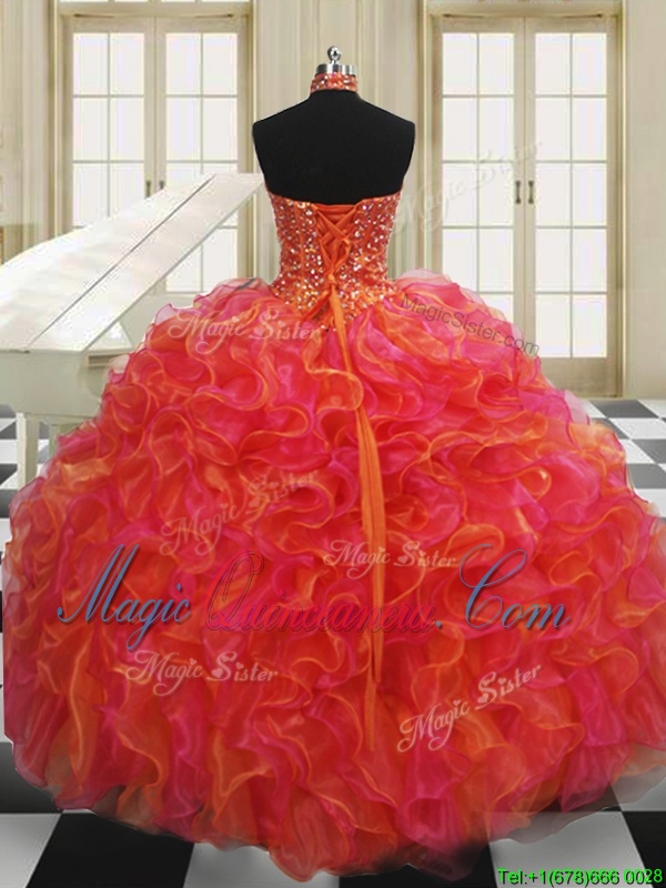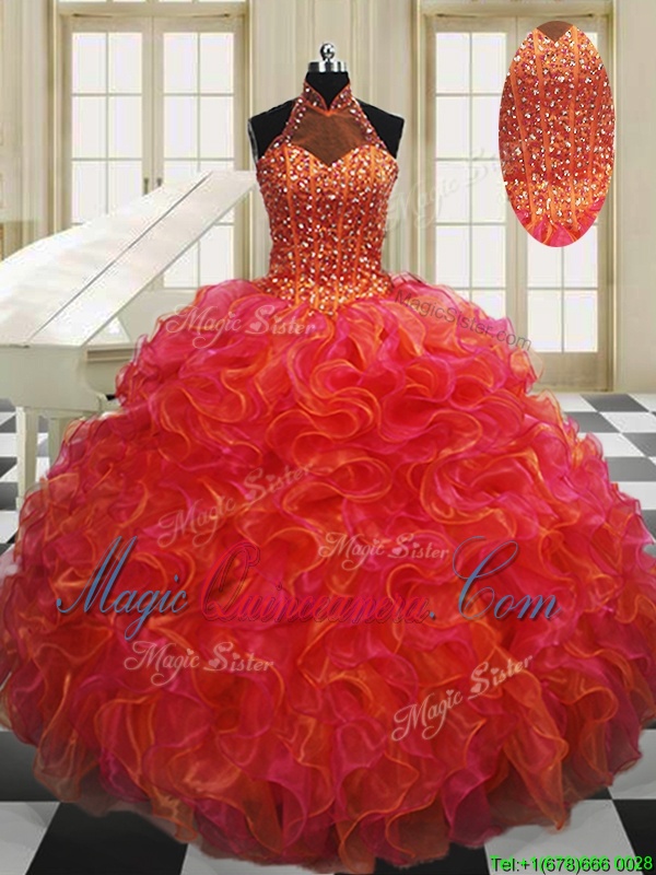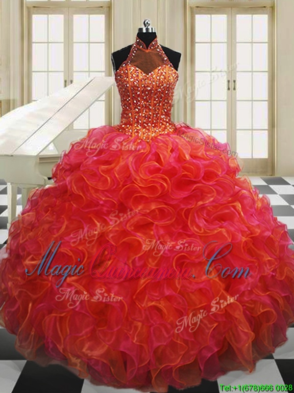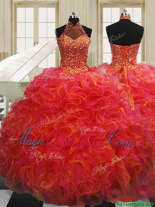 Great Halter Top Sleeveless Floor Length Beading and Ruffles Lace Up Quinceanera Dress with Multi-color