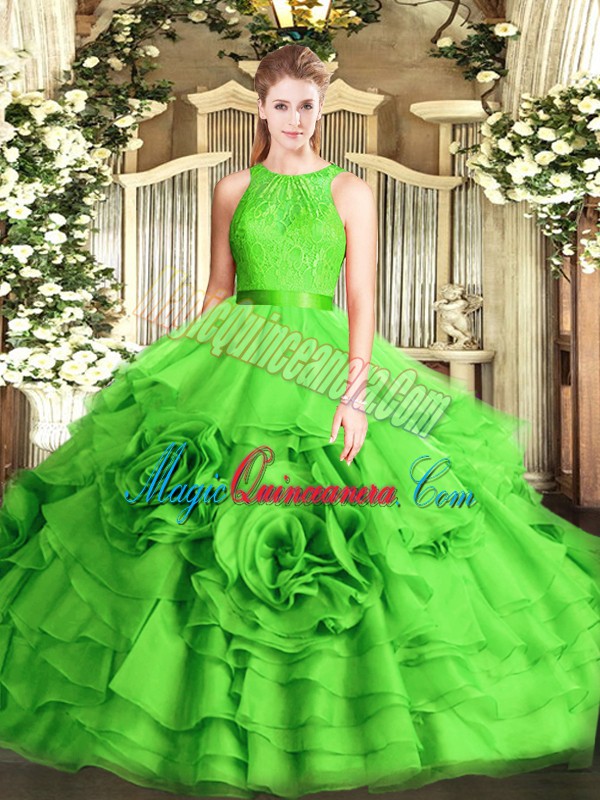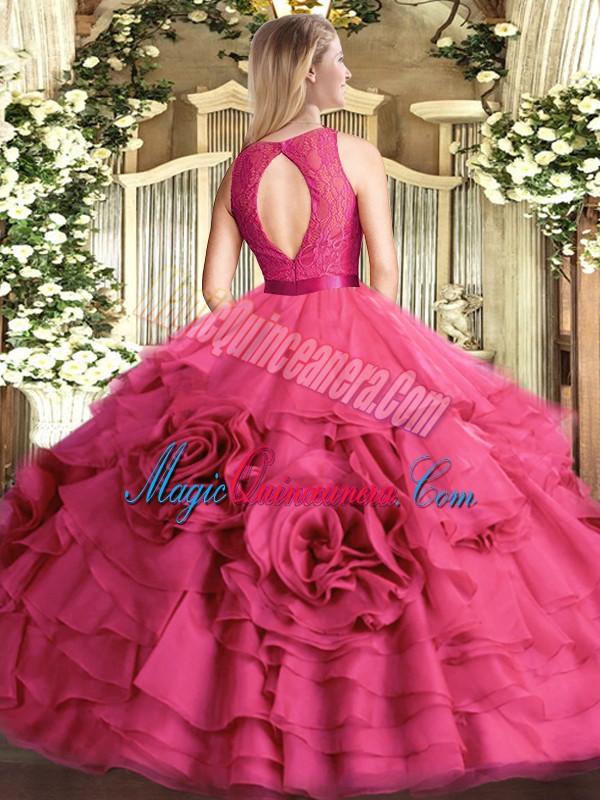 Great Scoop Sleeveless Fabric With Rolling Flowers Quince Ball Gowns Lace Zipper