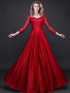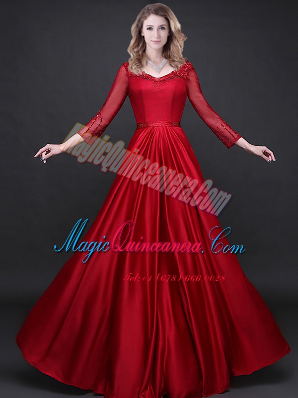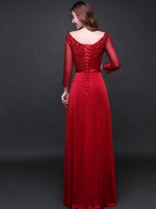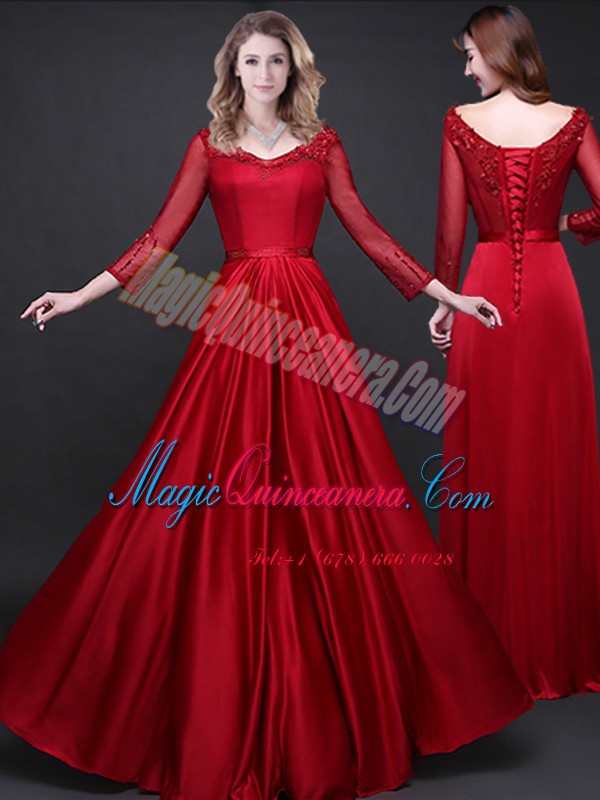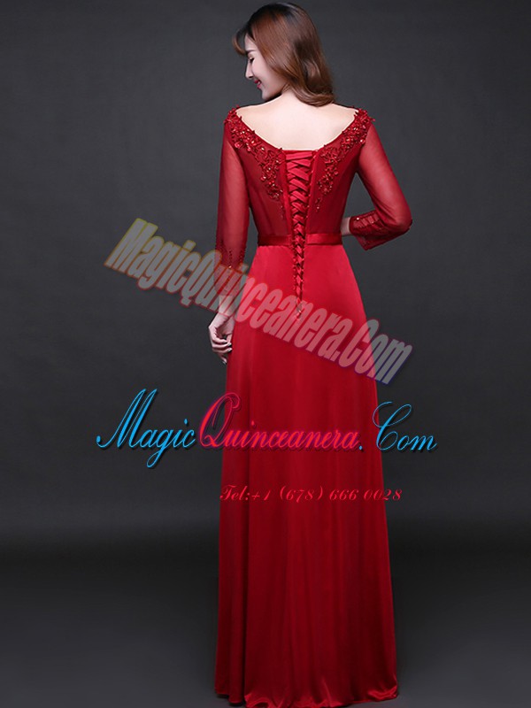 Great Wine Red Lace Up Prom Gown Appliques and Belt Long Sleeves Floor Length