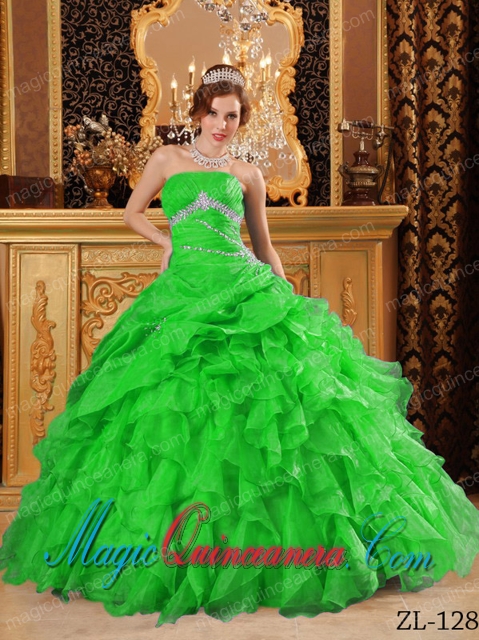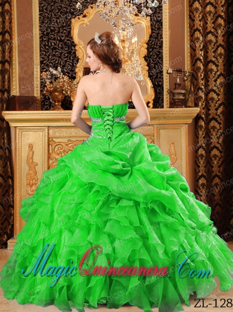 Green Ball Gown Floor-length Organza Beading And Ruffles Cute Quinceanera Dress