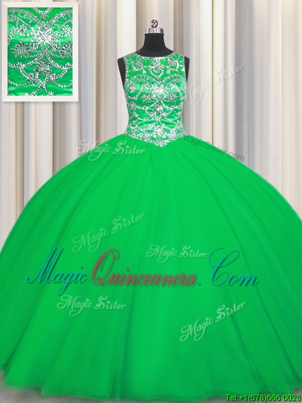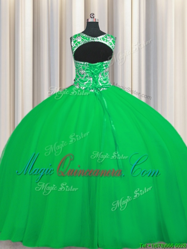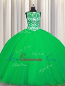 Green Ball Gowns Scoop Sleeveless Tulle Floor Length Lace Up Beading Sweet 16 Dresses