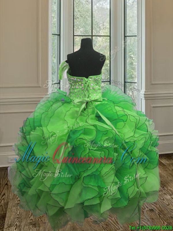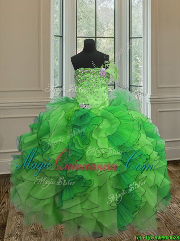 Green Ball Gowns Strapless Sleeveless Organza Floor Length Lace Up Beading and Ruffles Quince Ball Gowns