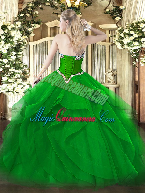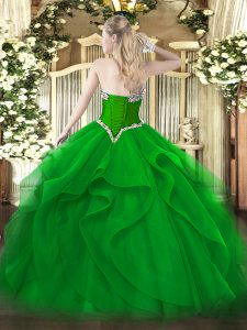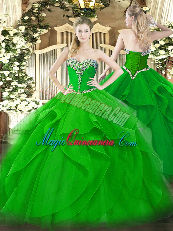 Green Ball Gowns Sweetheart Sleeveless Tulle Floor Length Lace Up Beading and Ruffles Quince Ball Gowns