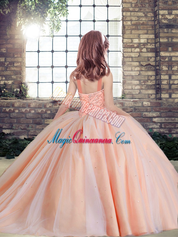 Green Ball Gowns Tulle Sleeveless Beading Floor Length Lace Up Evening Gowns