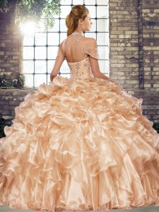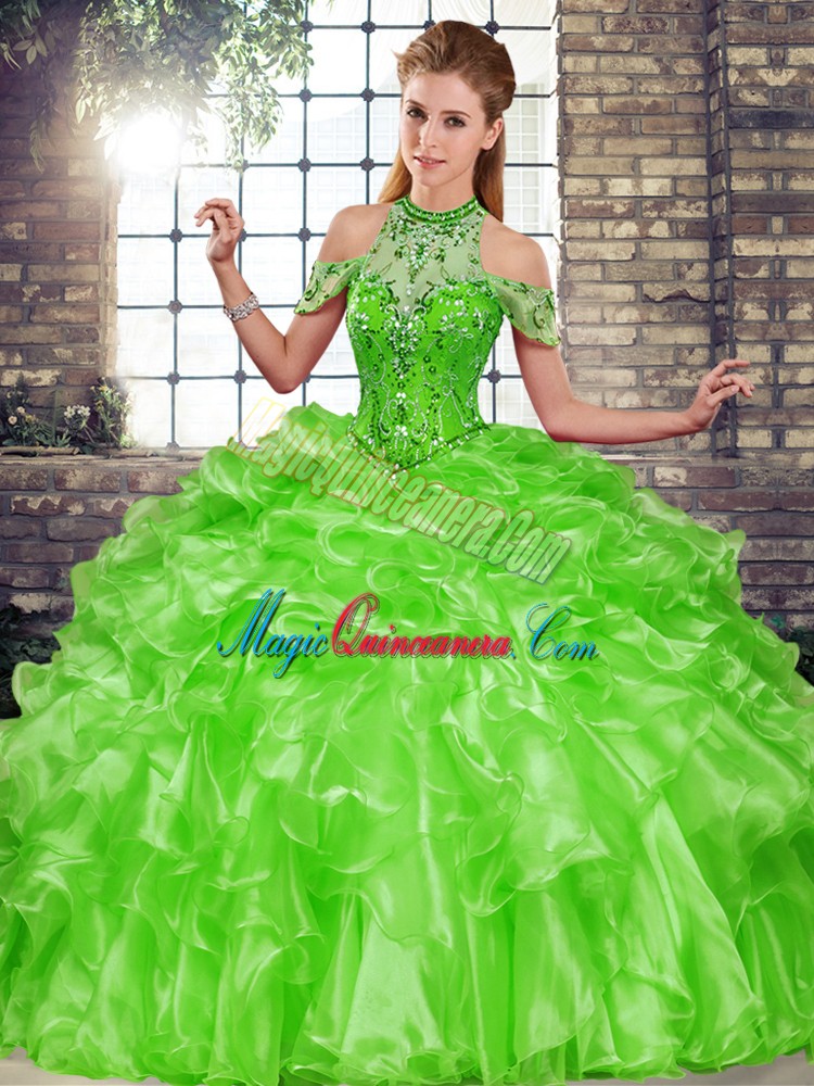 Green Lace Up Halter Top Beading and Ruffles Quinceanera Gown Organza Sleeveless