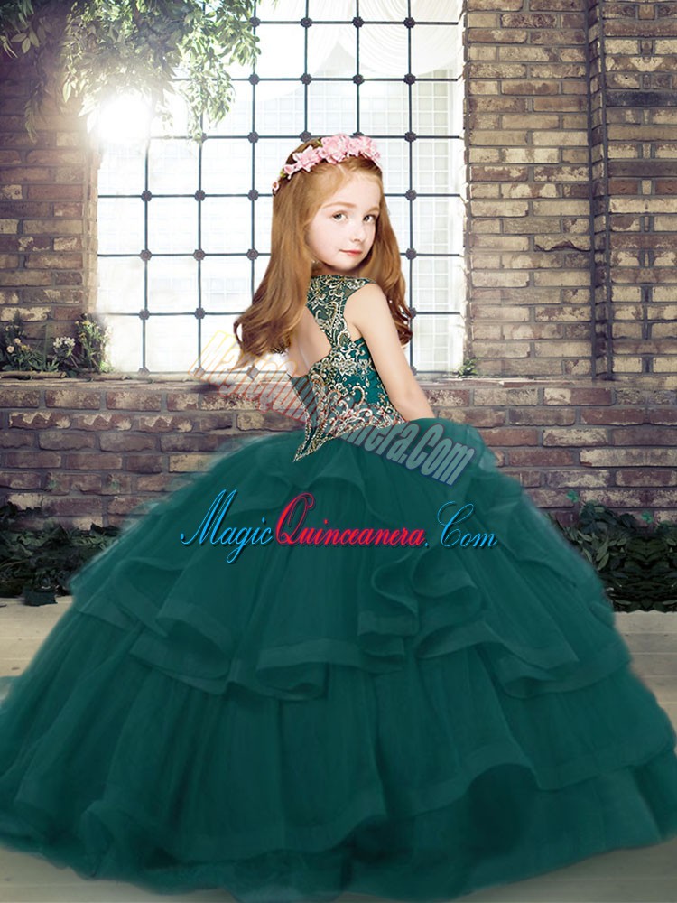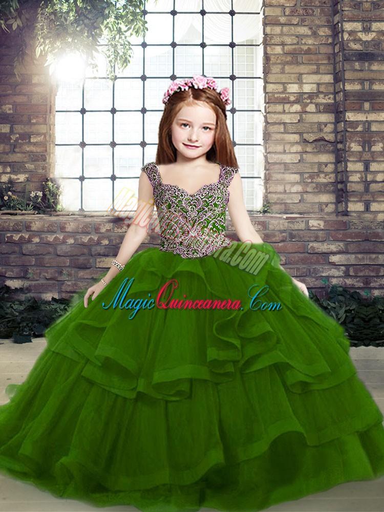 , Green Lace Up Kids Pageant Dress Beading and Ruffles Sleeveless Floor Length