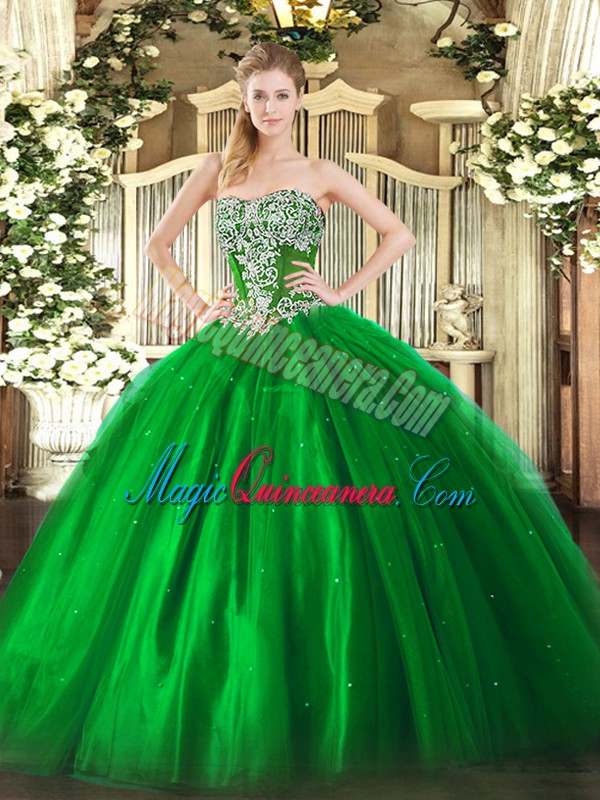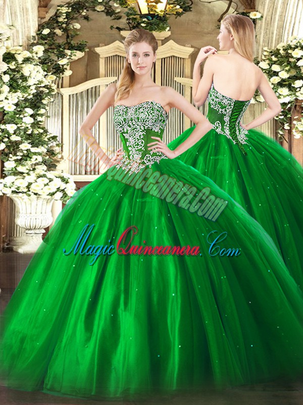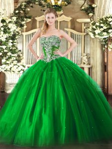 Green Sleeveless Floor Length Beading Lace Up Quinceanera Gowns
