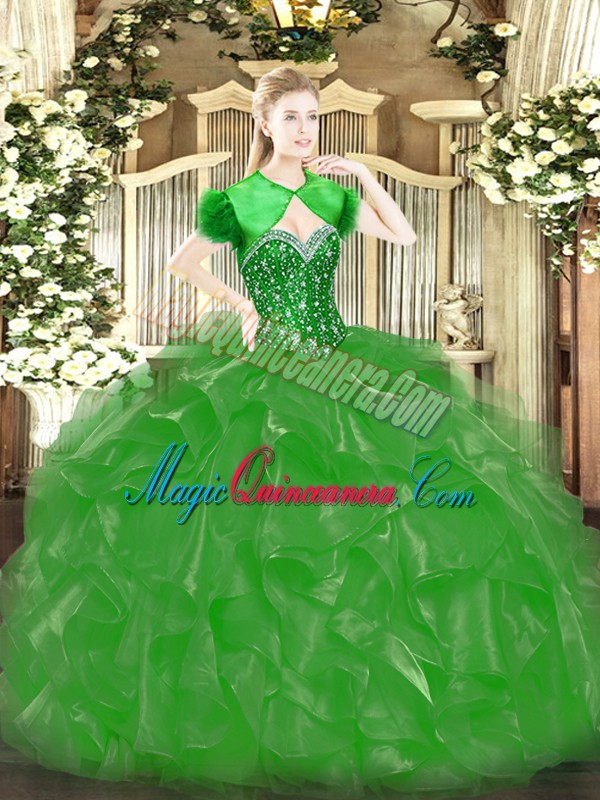 Green Sleeveless Organza Lace Up Ball Gown Prom Dress for Military Ball and Sweet 16 and Quinceanera