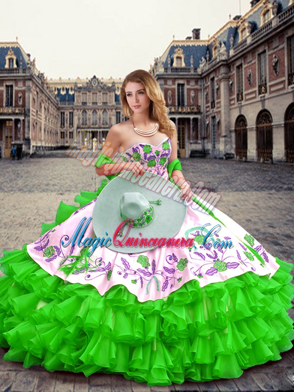 Green Sweetheart Neckline Embroidery and Ruffled Layers 15 Quinceanera Dress Sleeveless Lace Up