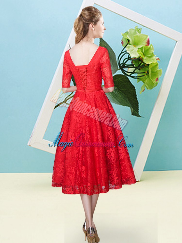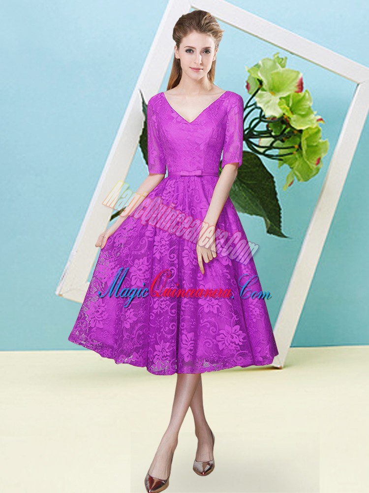 Half Sleeves Tea Length Bowknot Lace Up Dama Dress for Quinceanera with Fuchsia