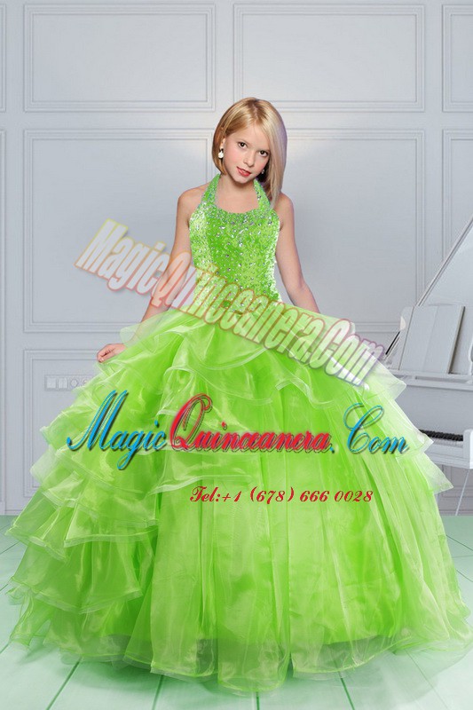 Halter Top Apple Green Sleeveless Floor Length Beading and Ruching Lace Up Little Girls Pageant Gowns