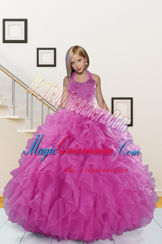 Halter Top Beading and Ruffles Custom Made Pageant Dress Pink Lace Up Sleeveless Floor Length
