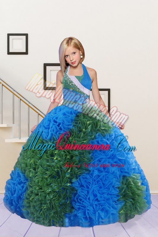 Halter Top Fabric With Rolling Flowers Sleeveless Floor Length Pageant Dress Toddler and Beading and Ruffles
