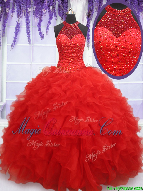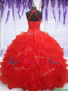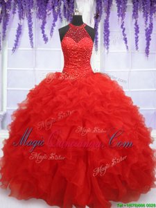 Halter Top Floor Length Lace Up Ball Gown Prom Dress Red and In for Military Ball and Sweet 16 and Quinceanera with Beading and Ruffles