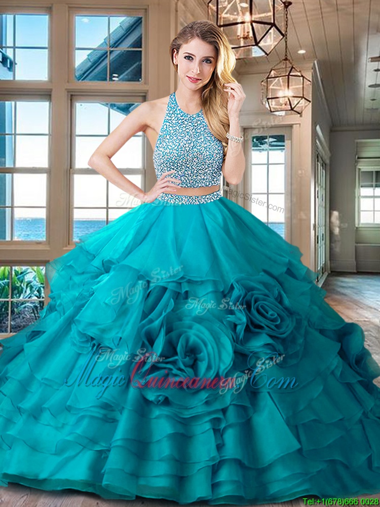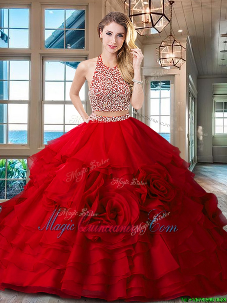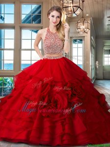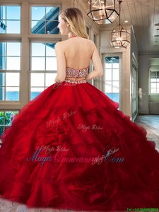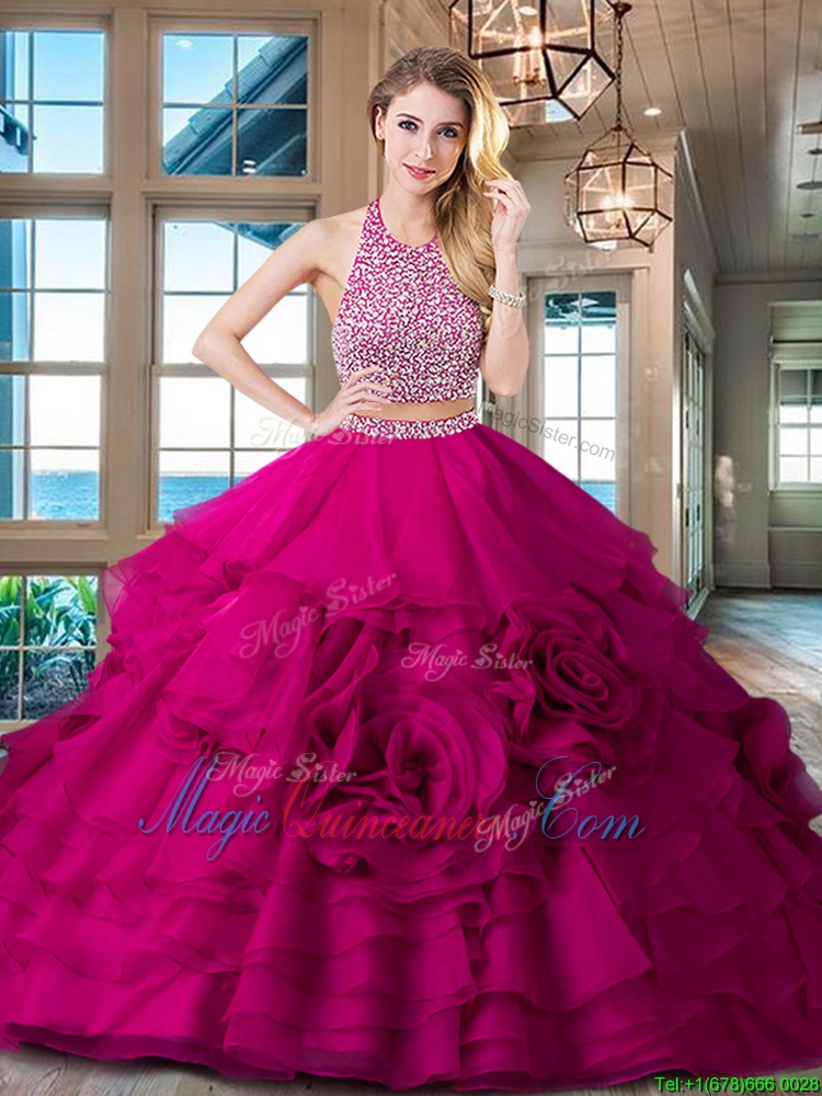 Halter Top Fuchsia Sleeveless With Train Beading and Ruffles Backless Sweet 16 Dresses