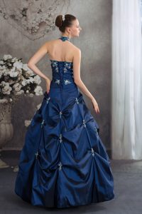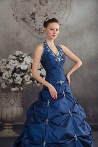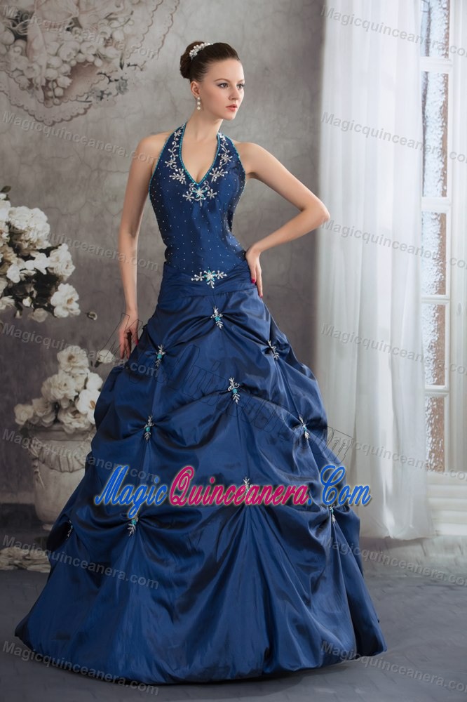 pretty 15 dress with pick ups, Halter Top Navy Blue Beaded Appliqued Quinceanera Dresses