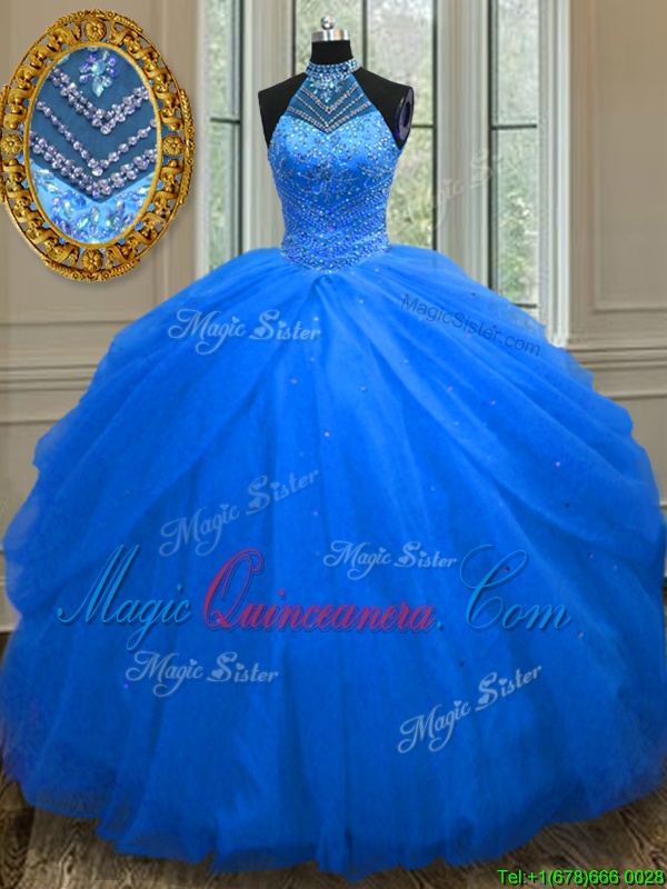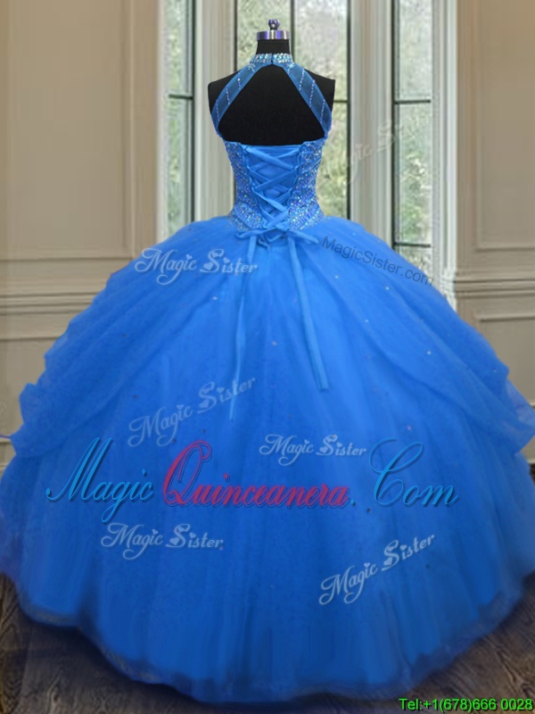 , Halter Top Royal Blue Sleeveless Floor Length Beading Lace Up Quinceanera Gown