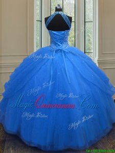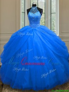 Halter Top Royal Blue Sleeveless Floor Length Beading Lace Up Quinceanera Gown