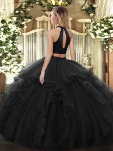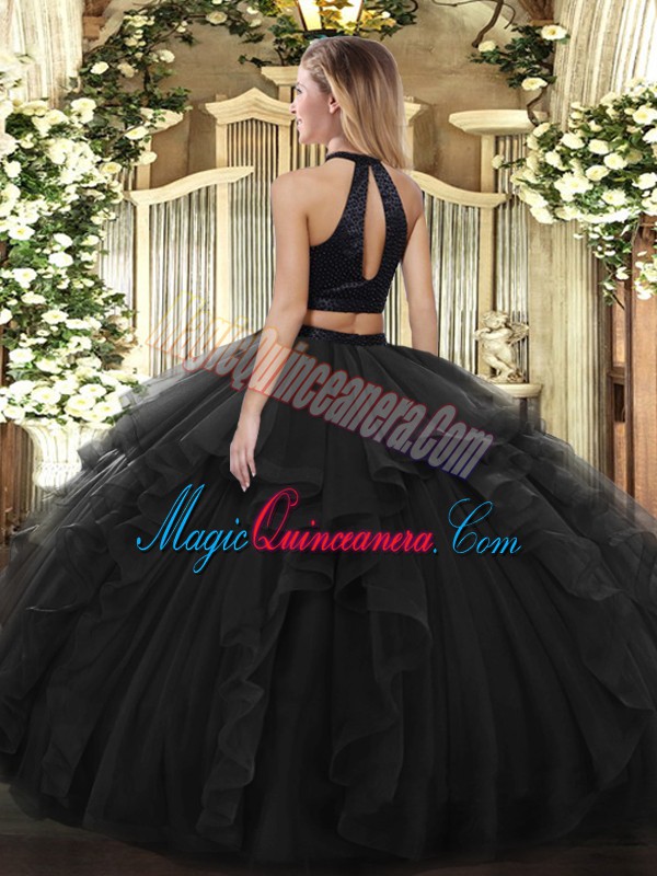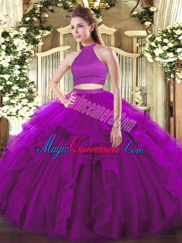 Halter Top Sleeveless 15th Birthday Dress Floor Length Beading and Ruffles Purple Tulle