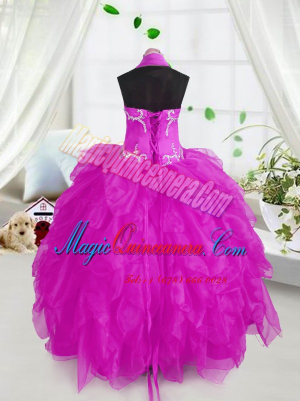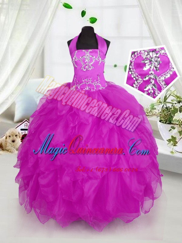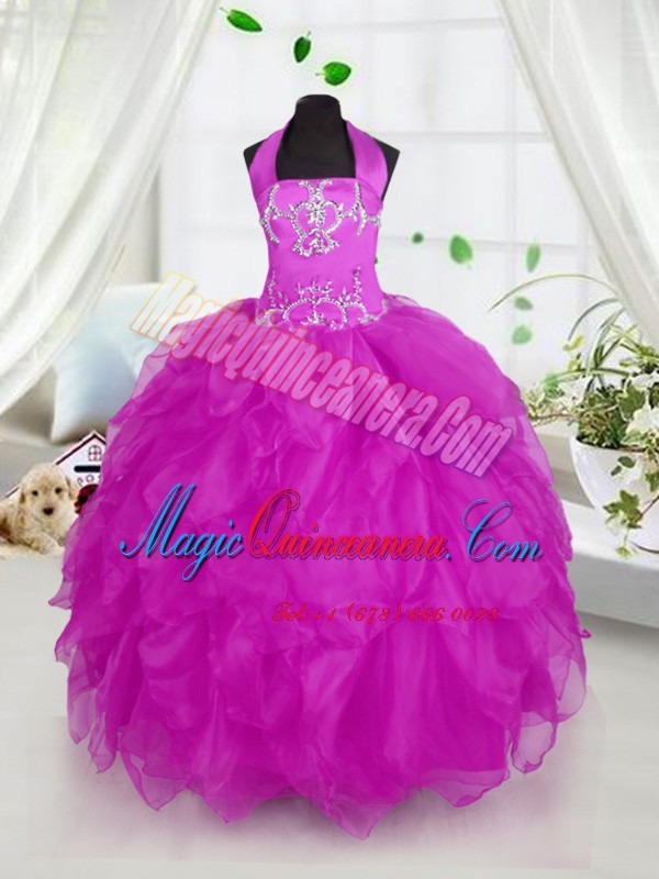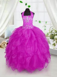 Halter Top Sleeveless Floor Length Appliques and Ruffles Lace Up Little Girls Pageant Dress Wholesale with Purple