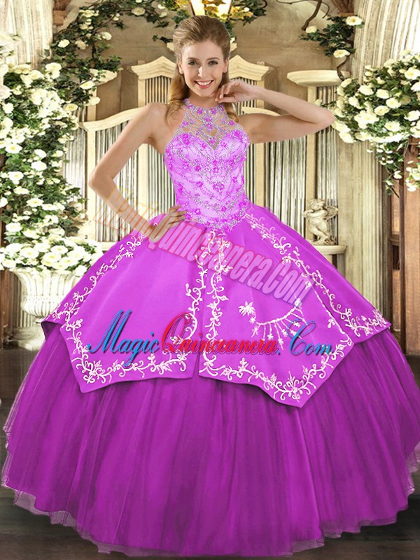 , Halter Top Sleeveless Lace Up 15th Birthday Dress Fuchsia Satin and Tulle