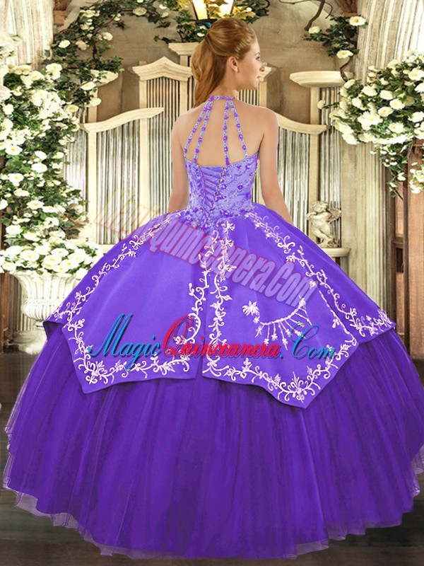 Halter Top Sleeveless Lace Up 15th Birthday Dress Fuchsia Satin and Tulle