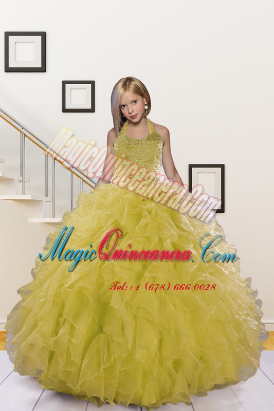 , Halter Top Sleeveless Lace Up Floor Length Beading and Ruffles Pageant Dresses