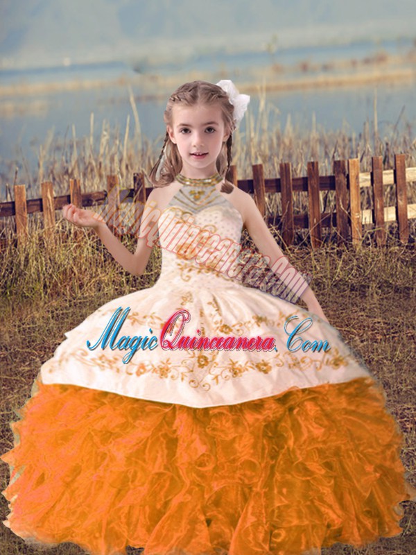 Halter Top Sleeveless Little Girl Pageant Dress Floor Length Beading and Embroidery and Ruffles Orange Red Organza