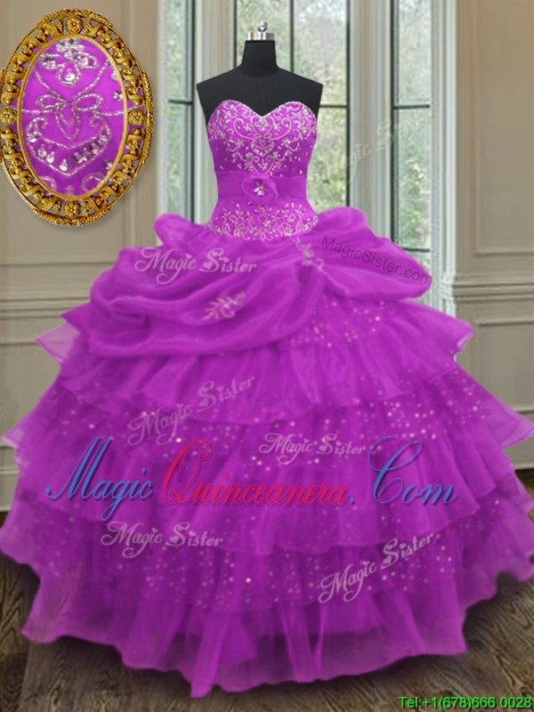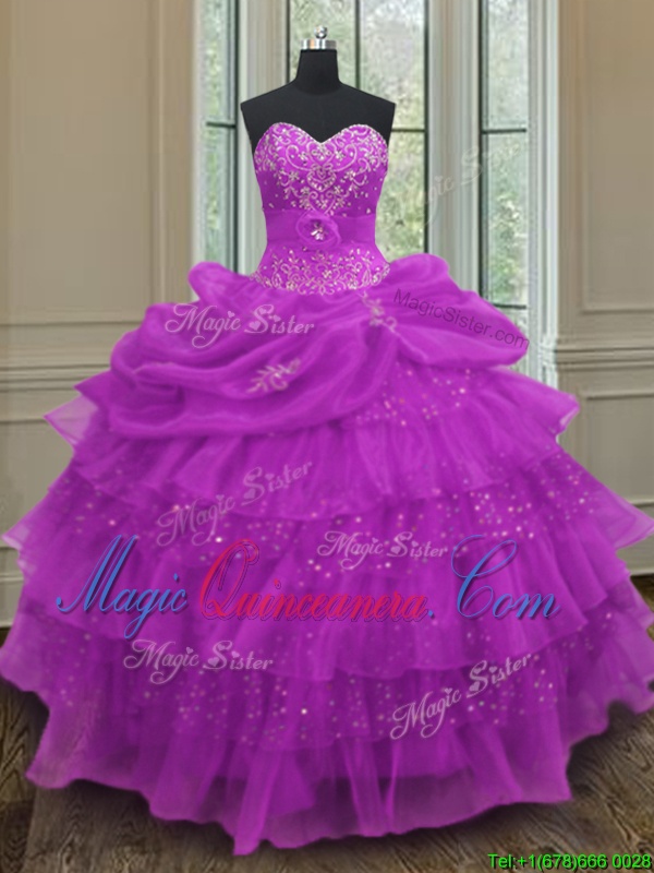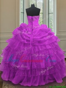 Halter Top Sleeveless Organza Floor Length Lace Up Vestidos de Quinceanera in Purple for with Beading and Ruffled Layers and Pick Ups