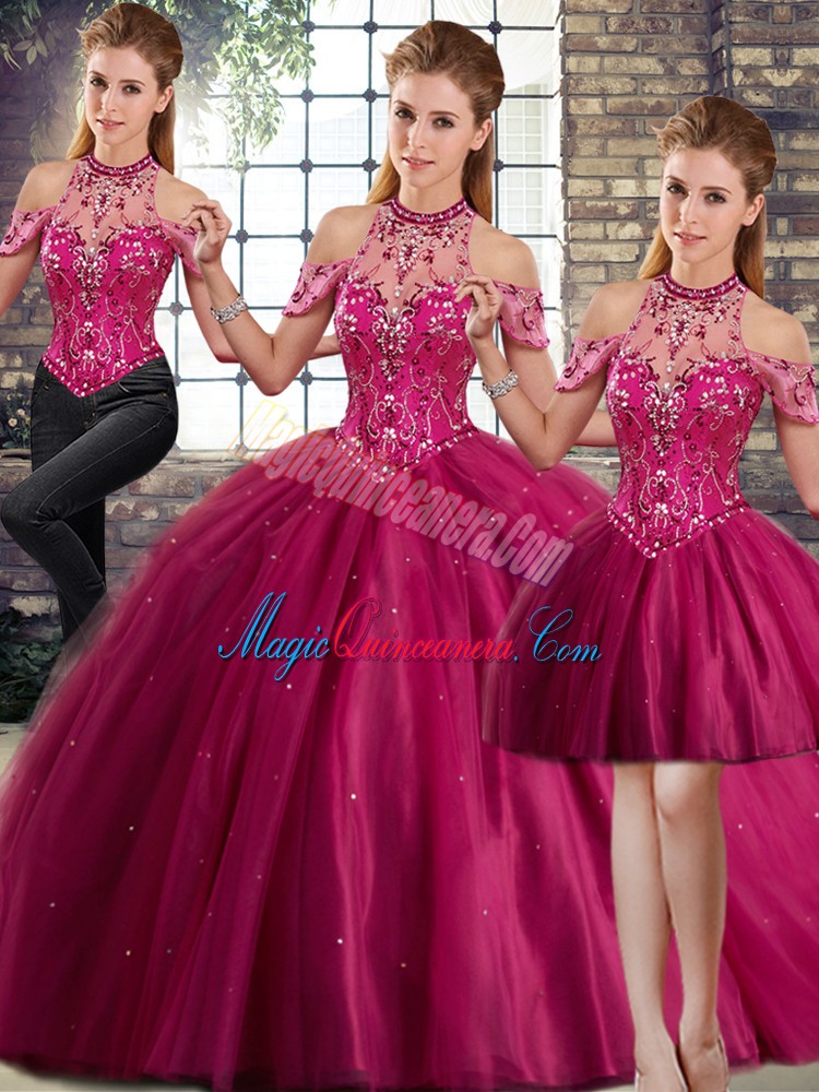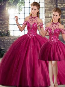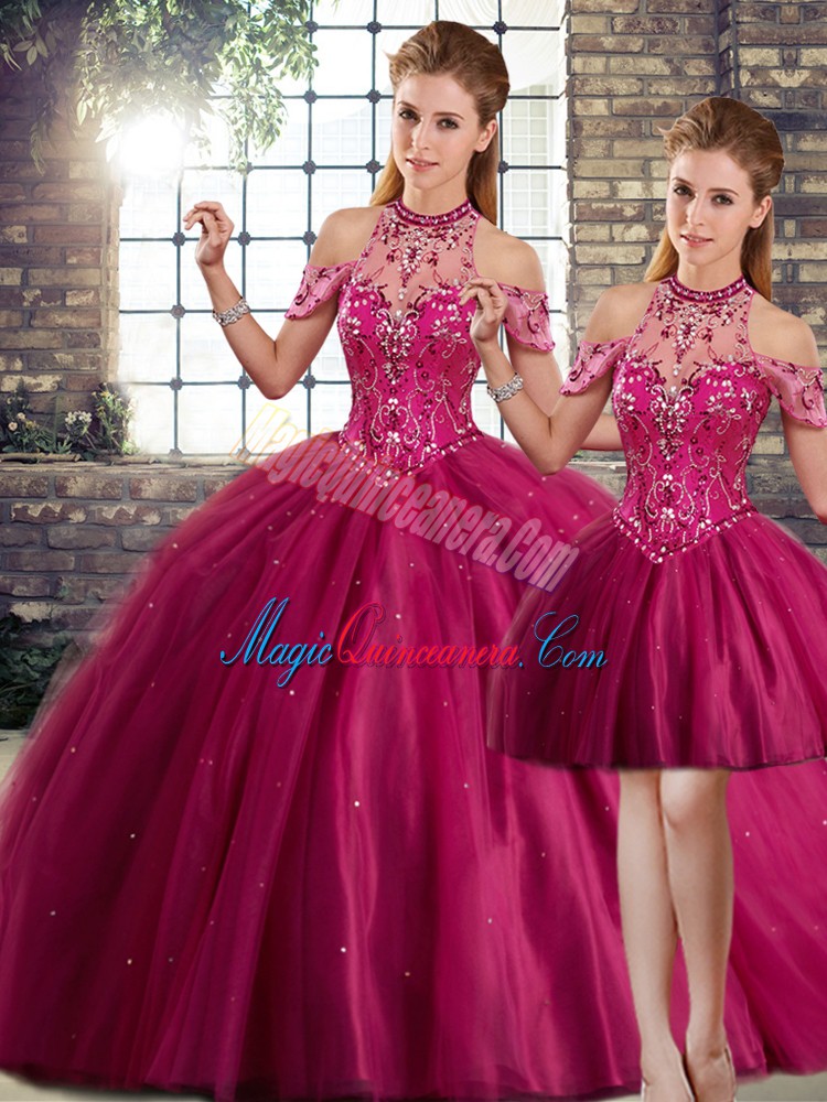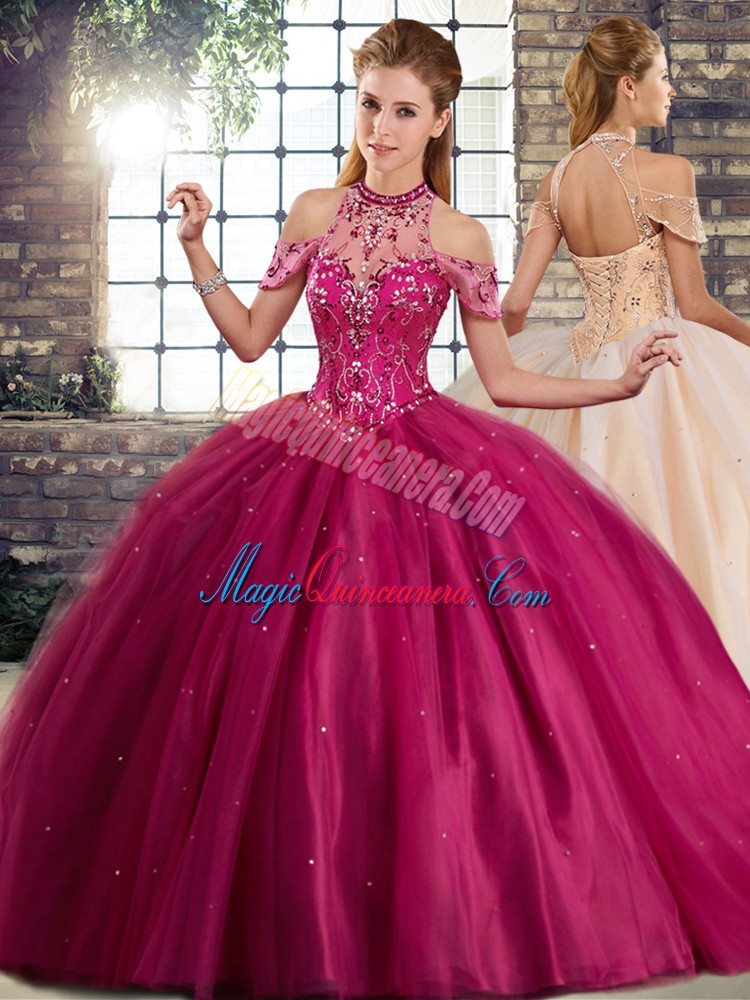 , Halter Top Sleeveless Quinceanera Dress Brush Train Beading Fuchsia Tulle