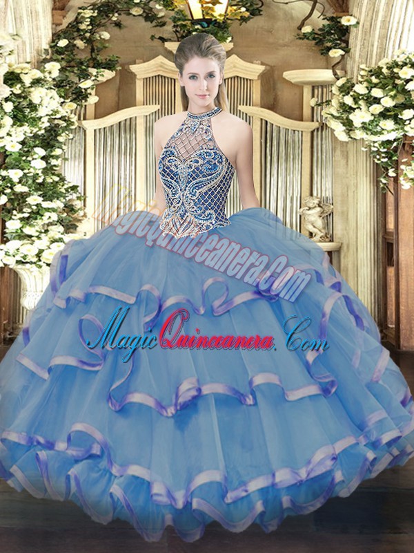 , Halter Top Sleeveless Quinceanera Gown Floor Length Beading and Ruffles Blue Organza
