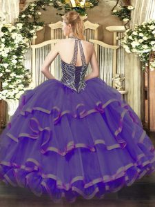 Halter Top Sleeveless Quinceanera Gown Floor Length Beading and Ruffles Blue Organza