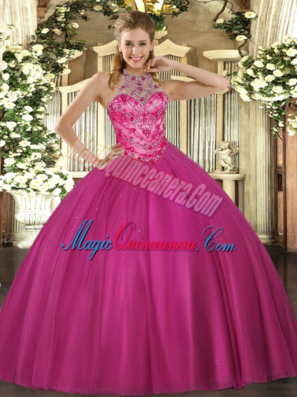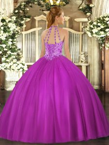 , Halter Top Sleeveless Satin Quince Ball Gowns Beading Lace Up