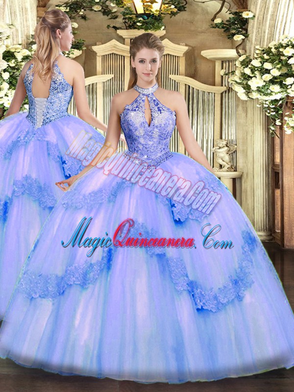 Halter Top Sleeveless Tulle Ball Gown Prom Dress Appliques and Sequins Lace Up