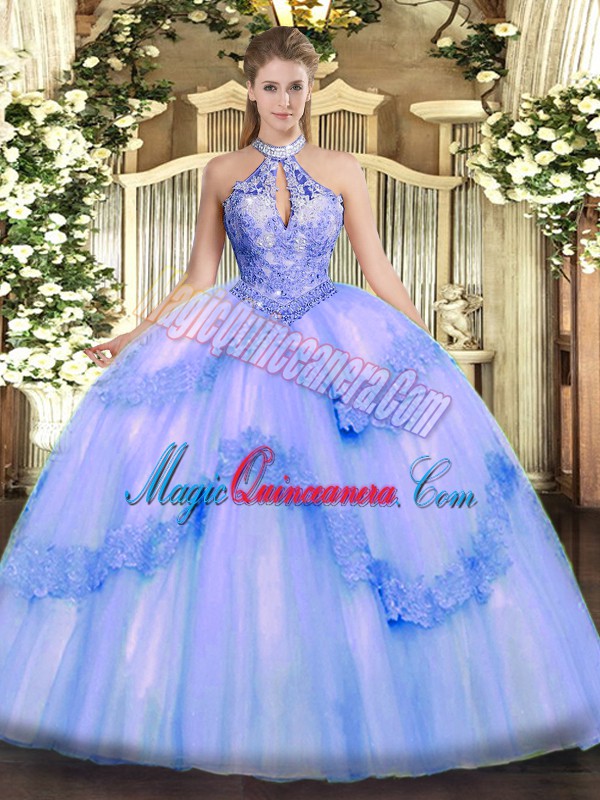 , Halter Top Sleeveless Tulle Ball Gown Prom Dress Appliques and Sequins Lace Up