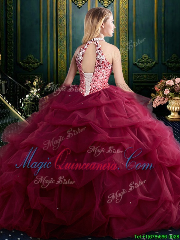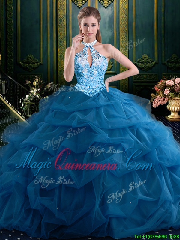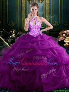 Halter Top Sleeveless Tulle Quinceanera Gowns Beading and Pick Ups Lace Up